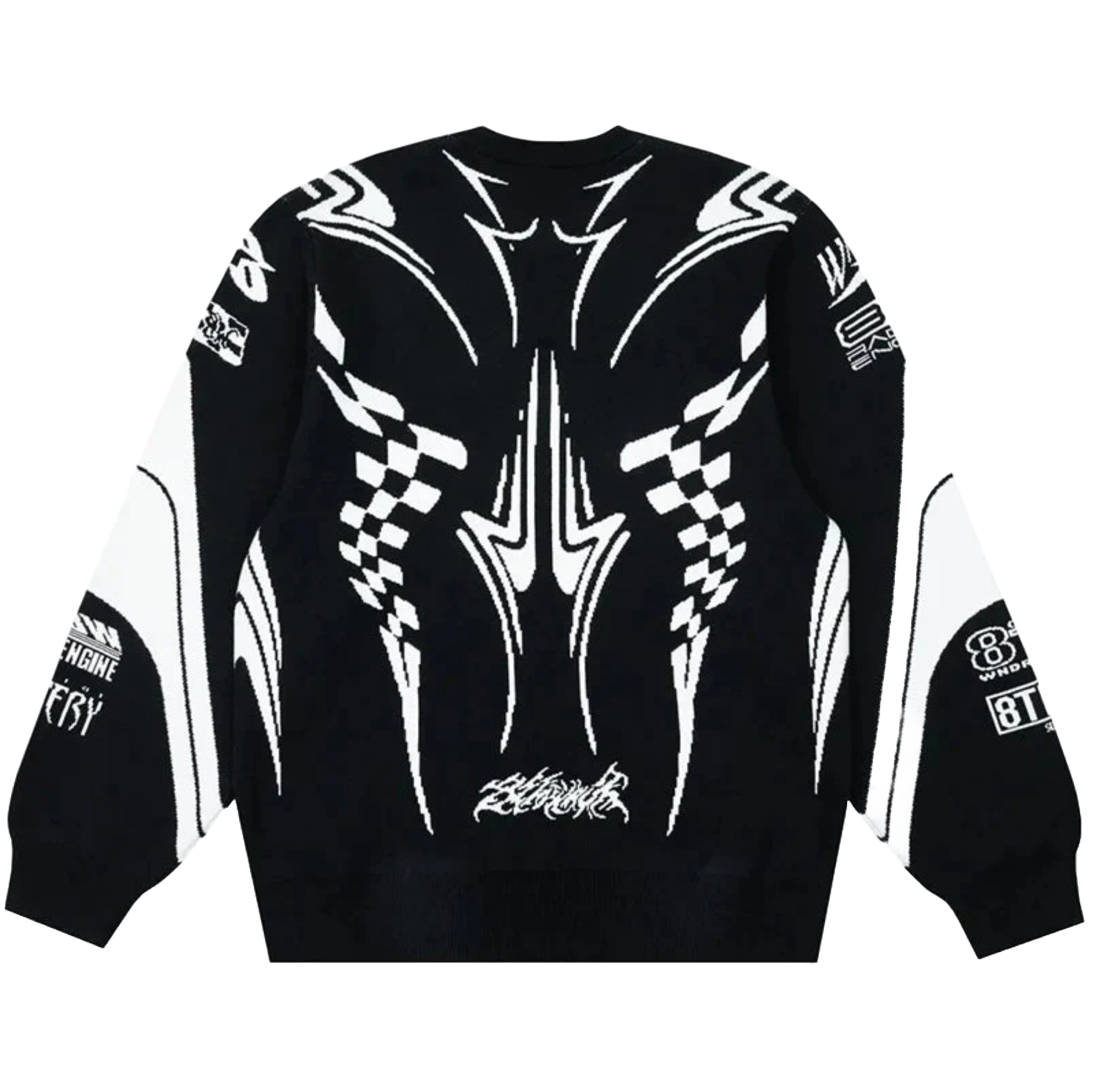 Bold black and white graphic sweater with dynamic racing-inspired details