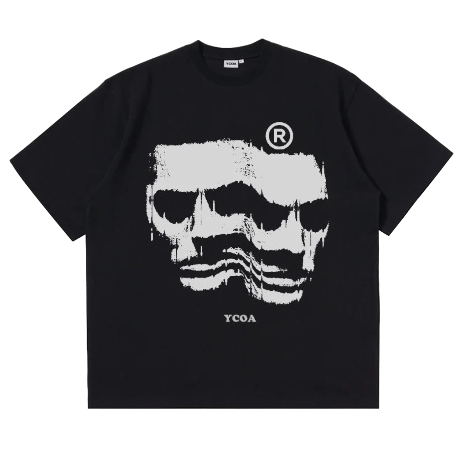 Oversized tee featuring a distorted dual-skull graphic for a bold, glitchcore aesthetic